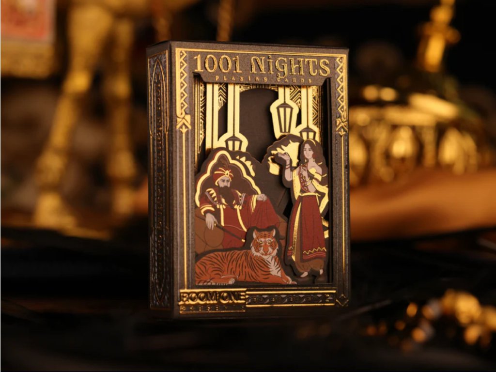 Encased in Room One's Signature Accordion 3D Tuck Box, behold King Shahryar and Scheherazade in it, each layered fold capturing their nightly dance of stories and suspense. Intricate embossing and hot foiling bring them to life, setting the stage for 55 custom cards steeped in the magic of the Arabian nights.