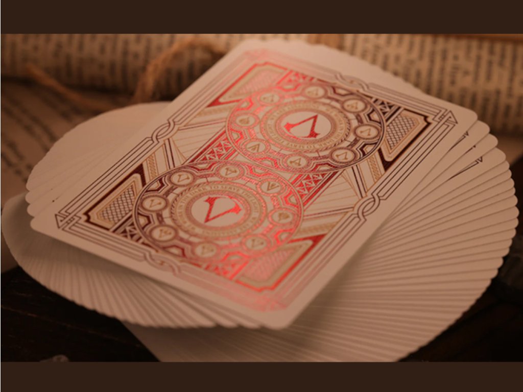 The faces feature an elaborate design that matches the backs. All lines are highlighted with shiny red foil, just like on the backs. You will also find a subtle but charming animation on them. When you riffle the deck, you will see an assassin running in the corners of the cards.